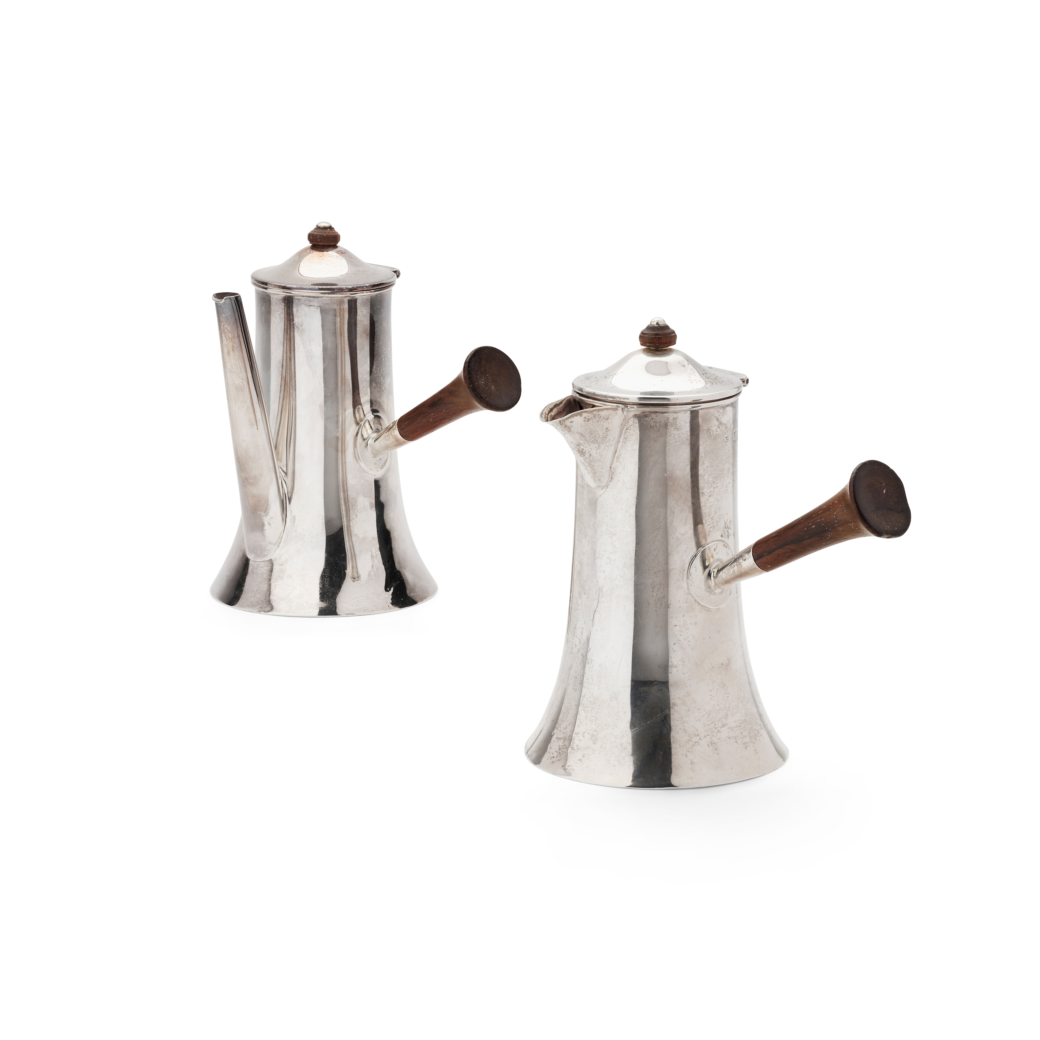 Each of flared cylindrical form, the wooden handles set to the side, the slightly domed hinged lids with wooden turned finials (2)