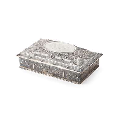 Of rectangular outline, all-over thistle, foliate scroll and mask chased decoration, the hinged engraved with presentation inscription dated 1938, gilt to interior