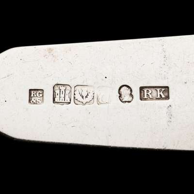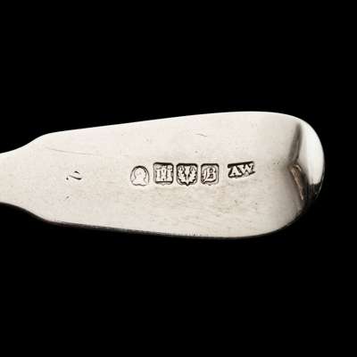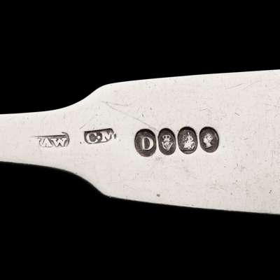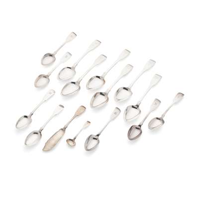Two retailed by Robert Grey & Sons of Glasgow, dated 1809, each of Fiddle pattern engraved initials to terminal; together with seven Fiddle pattern desserts spoon, five by Shaw Charles Marsh, Dublin 1824; together with a fish knife and a condiment spoon (15)