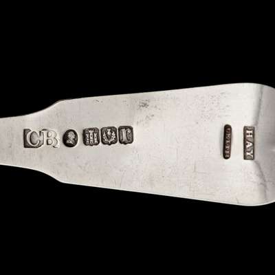 Marked CB, with Edinburgh hallmarks 1823, stamped HAY LEITH, of Fiddle pattern, foliate G engraved to terminal
