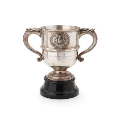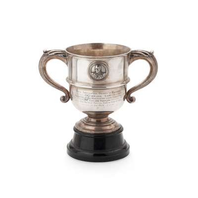 Of traditional waisted form, oval cartouche set to either side of body, Manchester coat of arms to one side and depiction of George V when he was Duke of York and President of the Agricultural Society, engraved presentation inscription to lower body, ‘…CHAMPION CUP…, and ’MANCHESTER MEETING/ 1897' to the other side, acanthus clasped S-scroll handles, raised on a domed stepped foot, presented with a plinth