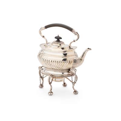 Of demi-fluted oval outline, gadrooned border, the stand of similar decoration raised on four S-scroll legs with beaded detail to four ball feet, burner intact