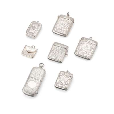 To include, four rounded rectangular examples, all with engraved scroll foliate decoration; together with a double ended vesta case, a vinaigrette and stamp box modelled as an envelope (7)