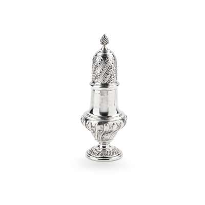 Of baluster outline, with fluted detail to lower body, the pierced pull-off lid with flame finial, raised on a domed foot with similar fluted detail