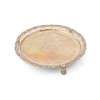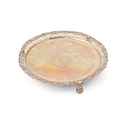 Of circular outline, engraved initials J.S. to centre within a cartouche, engraved border to dish, the raised border of pierced design, raised on three pierced bracket feet