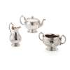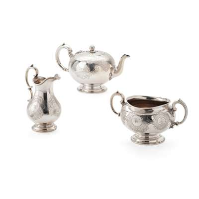 Comprising a teapot, twin-handled sugar basin and a milk jug, all of bulbous form, engraved scroll decoration throughout, engraved W to cartouche of one side of body to each, ivory insulators to the C-scroll teapot handle, bud finial to hinged lid of teapot, each raised on a domed circular foot (3)