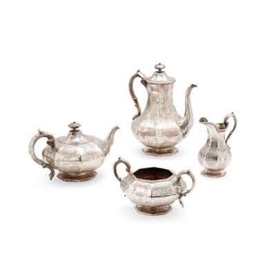 Comprising a teapot, waterpot, twin-handled sugar basin and a milk jug, all of octagonal panelled form, engraved scroll floral decoration throughout, ivory insulators to the teapot and waterpot handle, each raised on an octagonal foot (4)