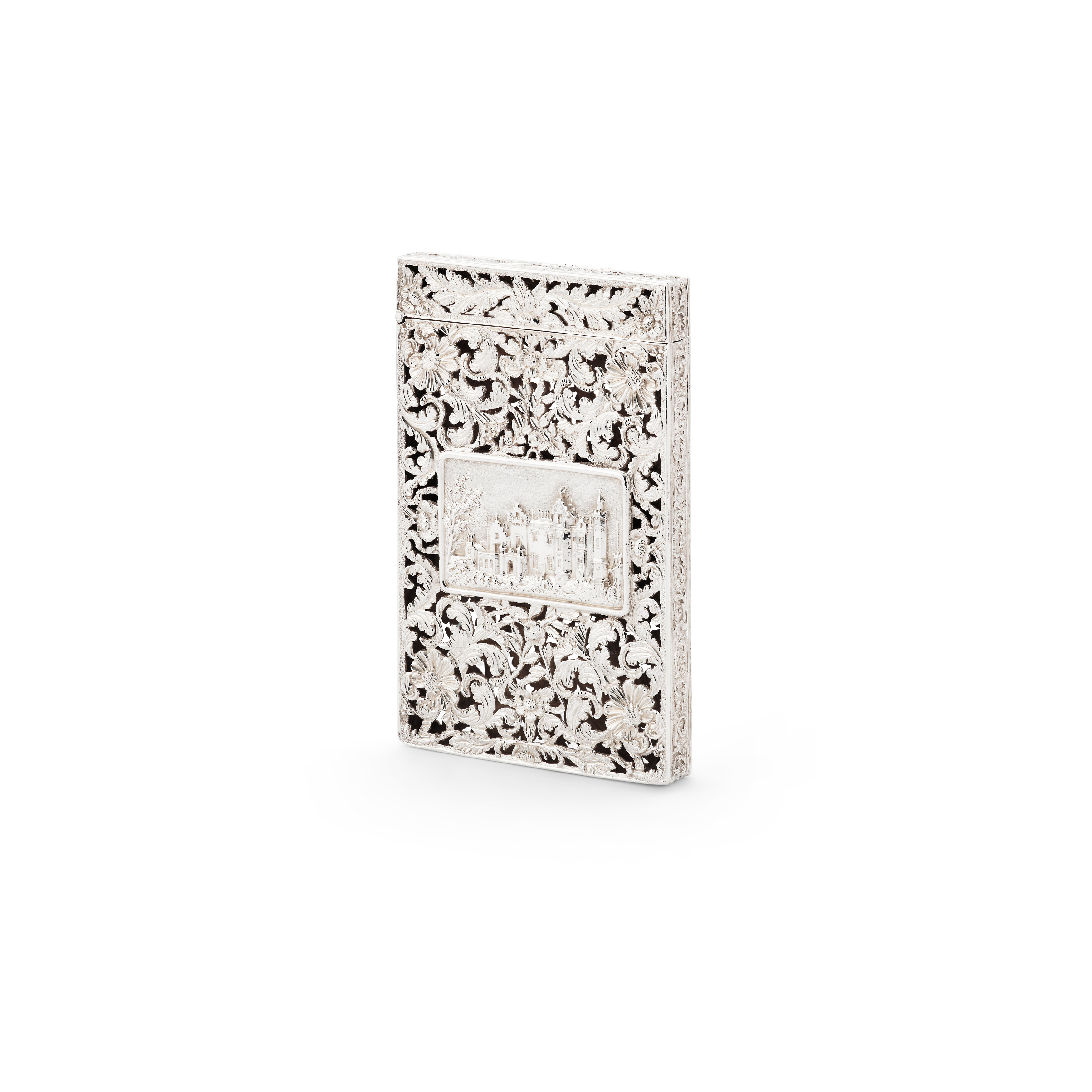 Of rectangular outline, pierced floral scroll work, depicting Abbotsford House, the home of Sir Walter Scott to one side and Newstead Abbey, the ancestral home of Lord Byron to the other