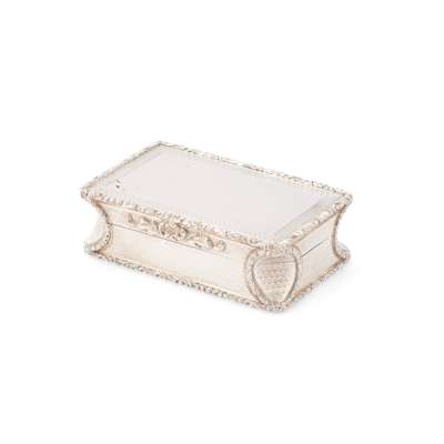 Of rectangular outline with canted edges, engine-turned sides, with a cast floral border, the hinged lid with vacant cartouche, gilt interior