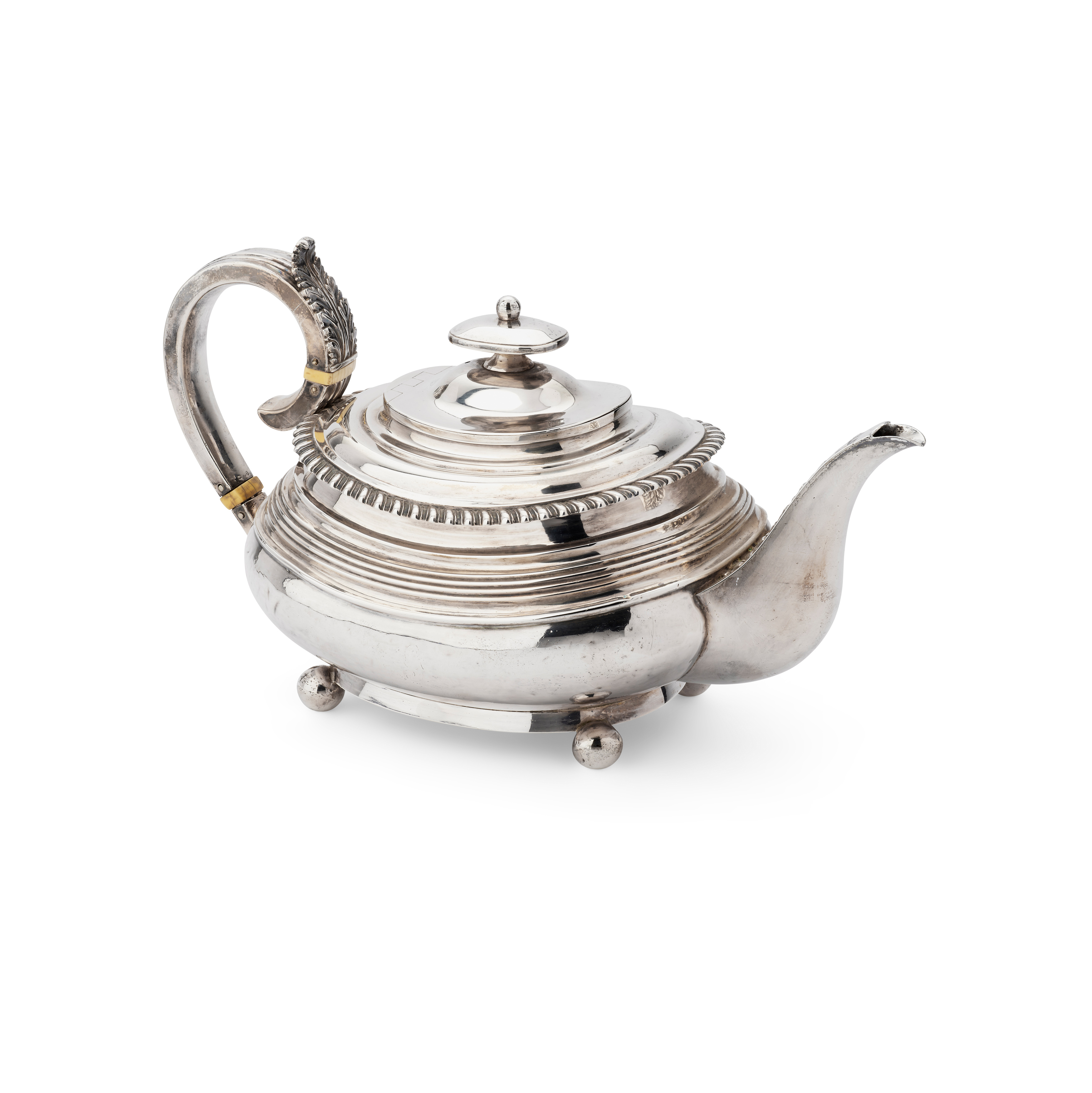 Of baluster form, with gadrooned border and reeded detail to body, foliate detail to spout and thumb piece, the scrolling handle with ivory insert, raised on four ball feet, engraved 1826 to the underside