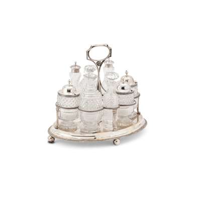 Of traditional form, the frame of oval outline with gadrooned borders, the central column with loop handle and shell motif, crest engraved to side of frame, the frame holding two oil cut-glass bottles, three silver-lidded cut-glass bottles, two blaster bottles with pierced silver lids and another cut-glass bottle, all raised on four bun feet