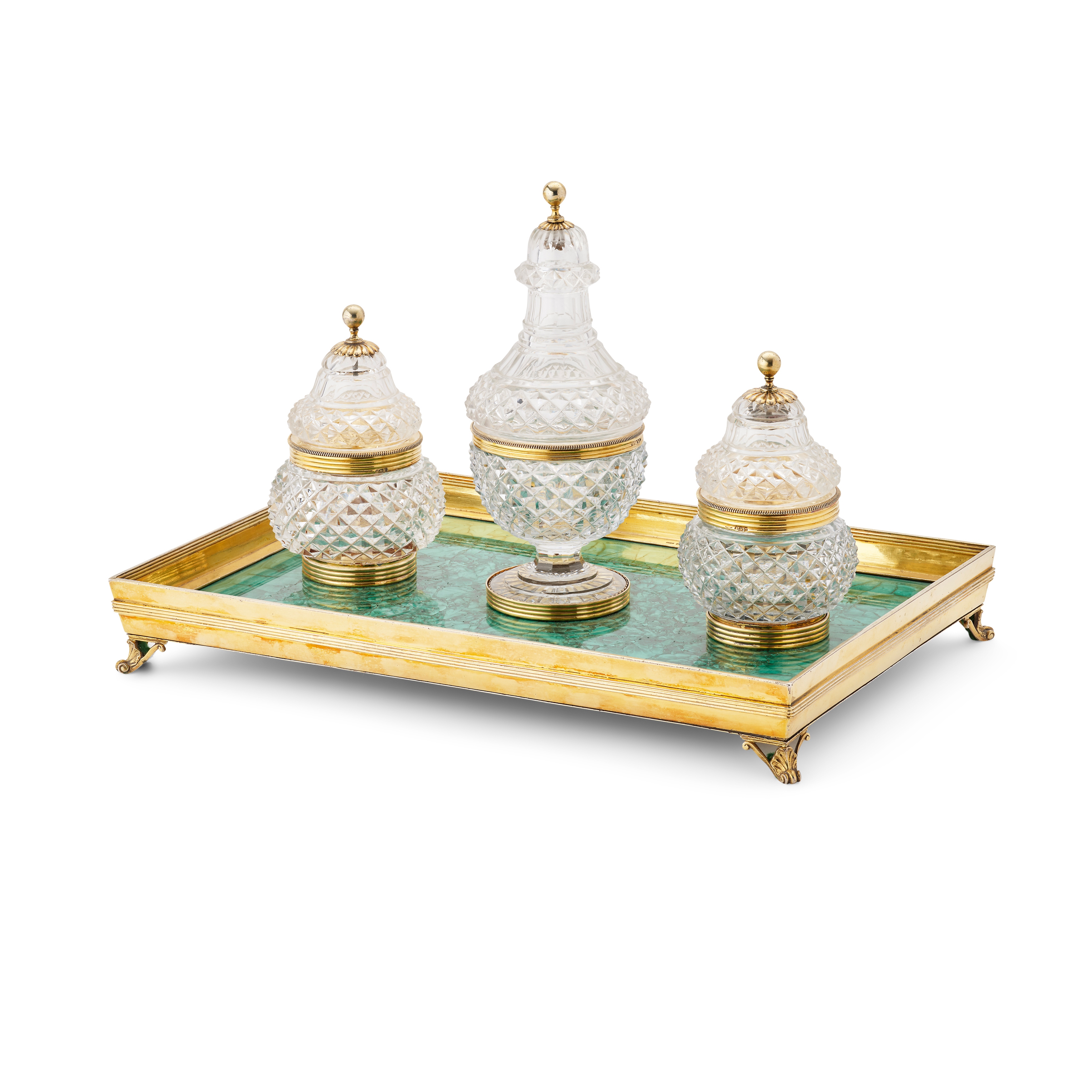 Of rectangular outline with an applied threaded border, the malachite dish inset with three silver-gilt wells, for various sized cut glass and silver-gilt applied bottles, raised on four shell and paw bracket feet