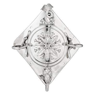 Of lozenge outline, the central circular cartouche with applied floral decoration, the terminals each set with cast detail of sea monsters and a cast horse's head