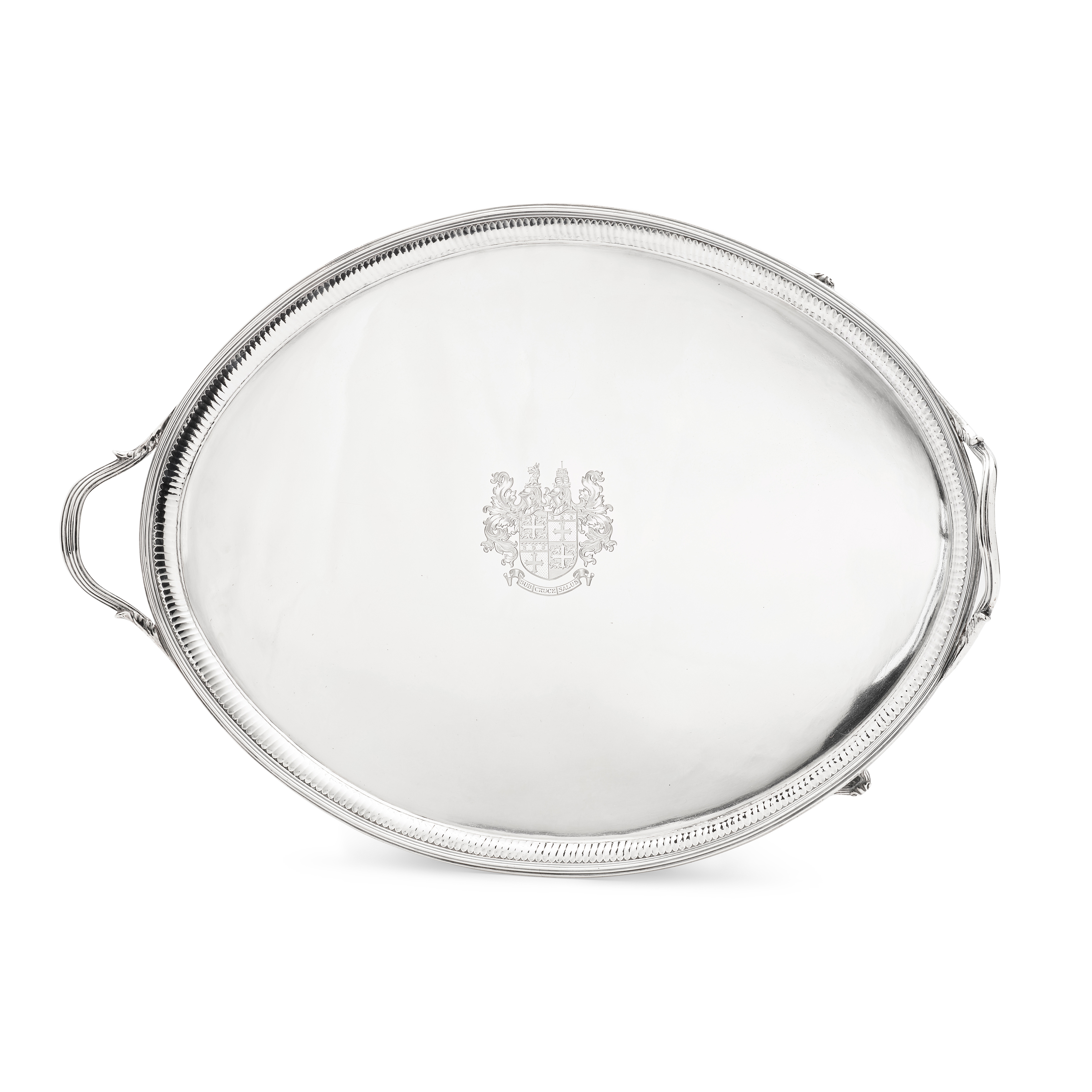Of oval outline, raised fluted border, with engraved coat of arms to the centre, the handles each with threaded detail, raised on four bracket feet