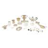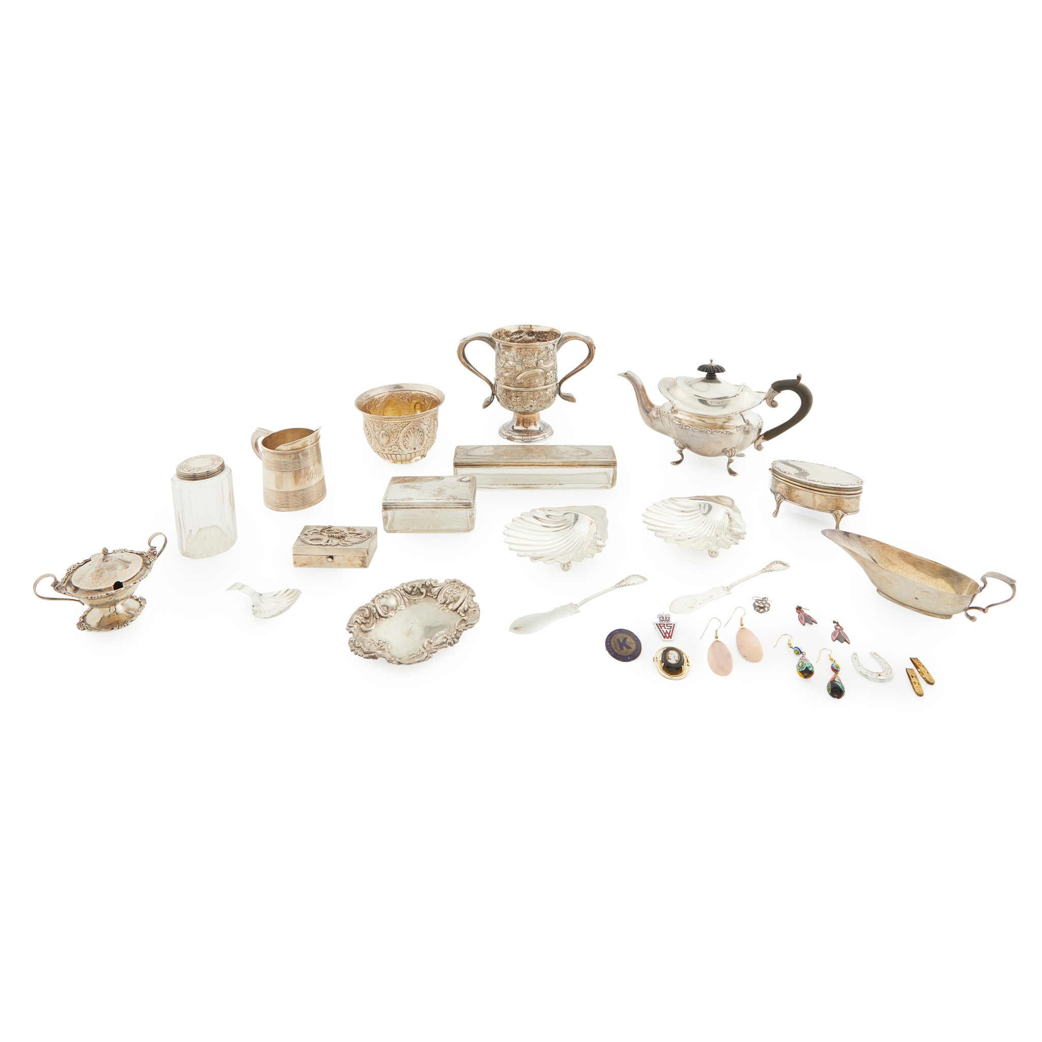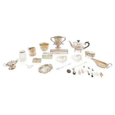 To include; an 18th-century twin-handled cup, later decorated, Newcastle; a dressing table box; a George III caddy spoon; a Victorian small sugar bowl; teapot; mustard pot and cover; small sauceboat; three lidded glass boxes; mug; cased pair shell dishes, etc.