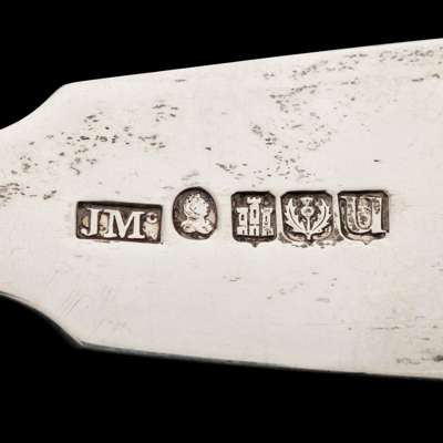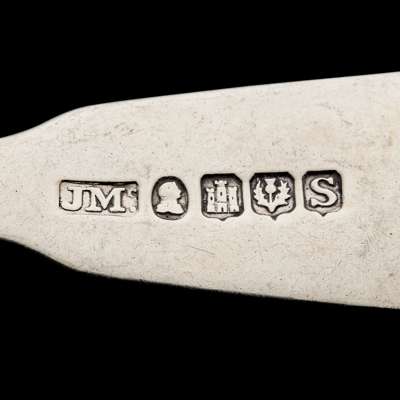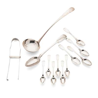 Of plain form; together with a soup ladle, Edinburgh 1802, of Old English pattern, engraved initials to terminal; a basting spoon James McKay, Edinburgh 1826; four various dessert spoons, London, italic J engraved to terminal and a set of six teaspoons, James McKay, Edinburgh 1824 (13)