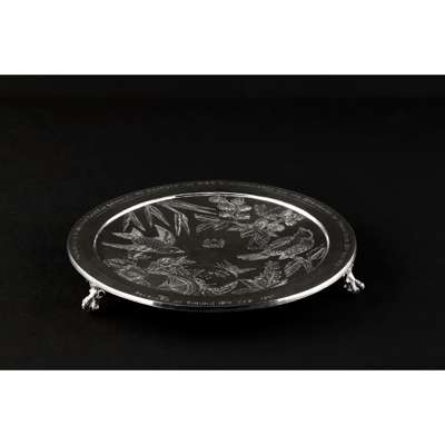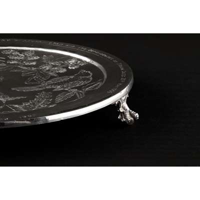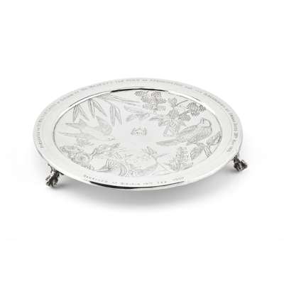 Of circular outline, finely engraved flora and fauna depictions to the centre, the border engraved with presentation inscription ‘PRESENTED TO Dr WALTER SAISE OF GIRIDIH BY HIS MAJESTY THE KING OF AFGHANISTAN AND ITS DEPENDENCIES BY FIRMAN DATED 20TH MAY 1906’, raised on ball and claw feet
