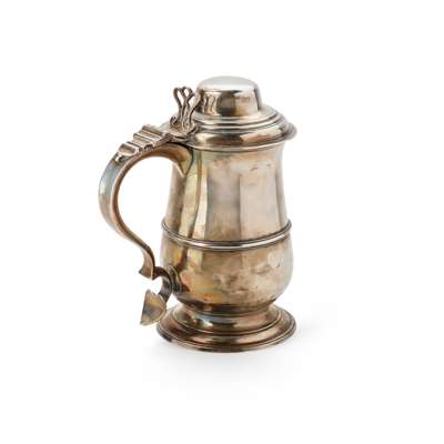 Of slightly baluster outline, waisted girdle. the S-scroll handle to a heart shaped terminal, domed hinged lid, raised on a stepped circular foot