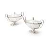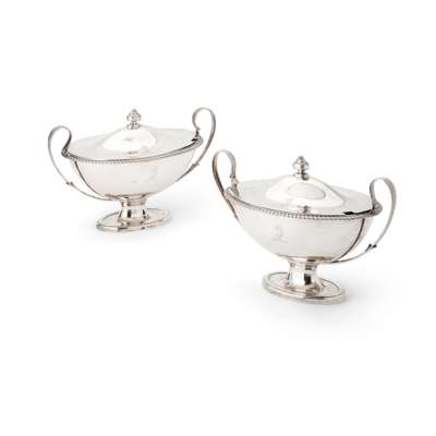 Each of oval outline, gadrooned border, coat of arms engraved to the side of the body and crest to the other side, threaded C-scroll handles, each raised on an oval foot, the pull-off lid (unmarked) with floral finial and engraved crest