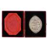 The navette shaped matrix with deeply cut armorial shield with bishops mitre above and motto ‘THE SEAL OF MATTHEW HUTTON ARCHBISHOP OF CANTERBURY 1757’ within foliate border, in a red Morocco leather and gilt tooled case with gilt bishops mitre to cover, the plush lined interior with a contemporary red wax impression of the seal