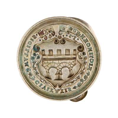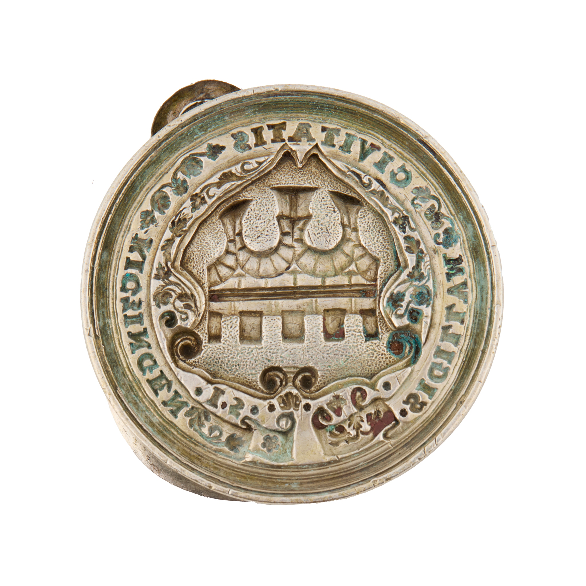 Of circular outline, engraved with the city coat of arms in a border of the SIGILLUM CIVITATIS KICZINGEN dated 1546 to the underside, to a foldable scroll handle