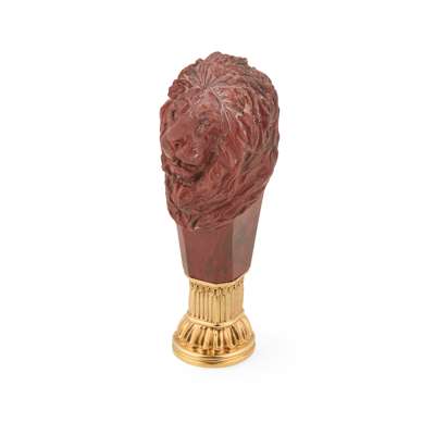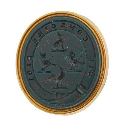 The handle carved as a lion mask, to a fluted gold mount and collar, the oval bloodstone matrix engraved, Nil Conscire sibi in a garter border, enclosing four various crests, of Coningsby (a seated rabbit), Waldo (a demi-leopard), Sibthorp (a demi-lion) and Williams (a cockerel), the motto is that of Sibthorp.