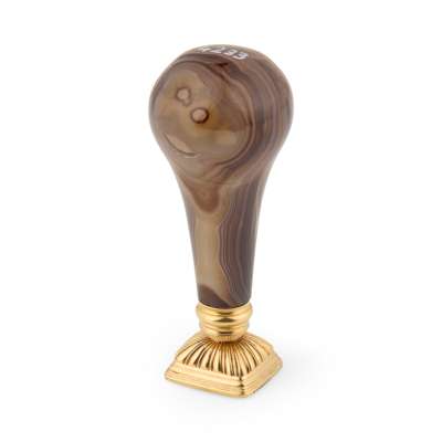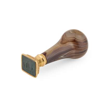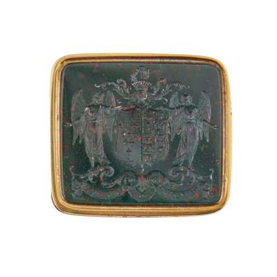 The domed banded agate handle to a fluted gold mount and collar, the rectangular bloodstone matrix engraved with coat of arms, supporters and motto