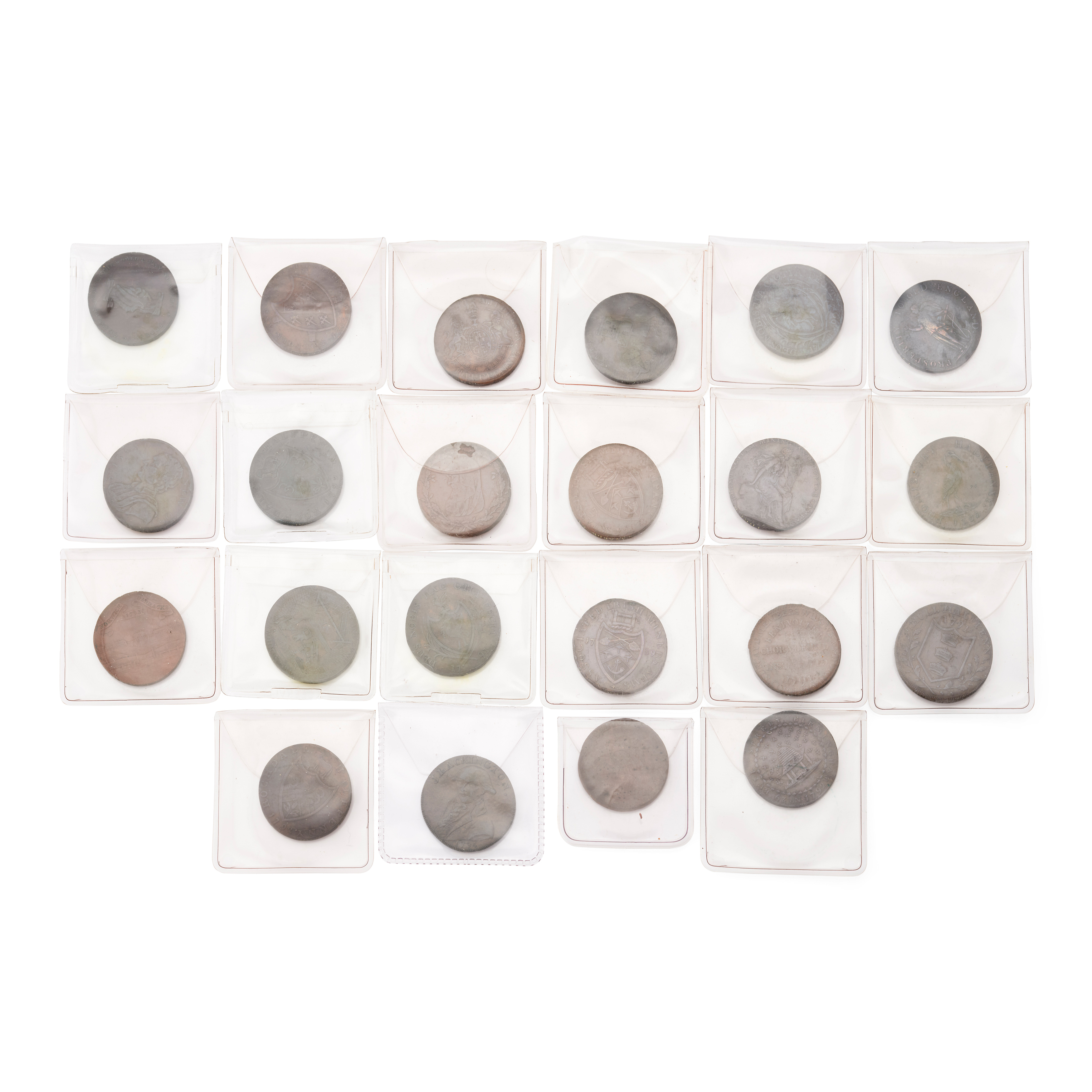 To include, Birmingham Mining half penny 179*; Liverpool half penny 1791; Coventry half penny 1793; Norwich Barrack’s 179*; Petersfield 1797 promissory half penny; Sir Issac Newton Half penny 1793; Norwich half penny 1792; Rochdale half penny 1792 x 2; Donald & Co. Half penny token 1792; and others in various condition