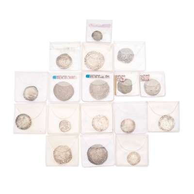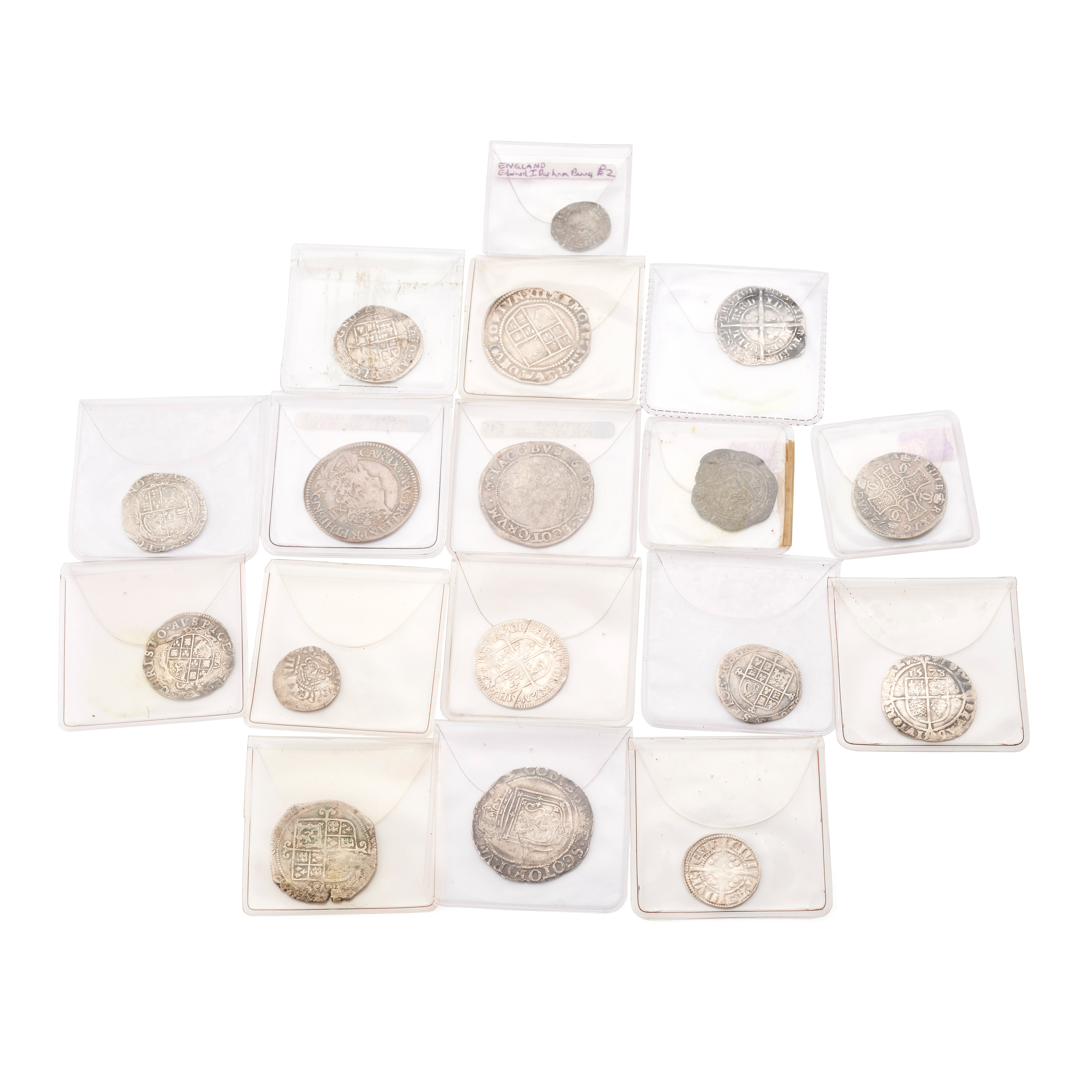 To include; James VI 10/- F; Scotland Charles II 1672 Merk, F; Scotland James V Plack, 1513-26 F, misshapen flan; Scotland Charles I twelve shillings Spink 5560; James VI Thistle Merk F/VF; Elizabeth I six pence, and nine other hammered coins