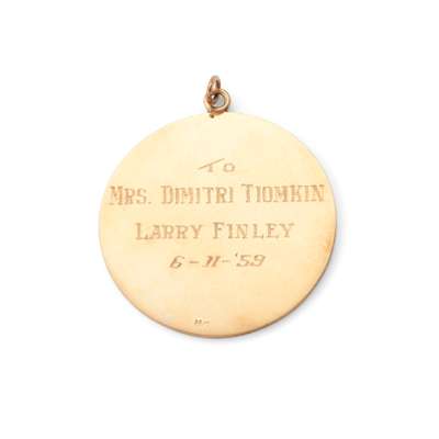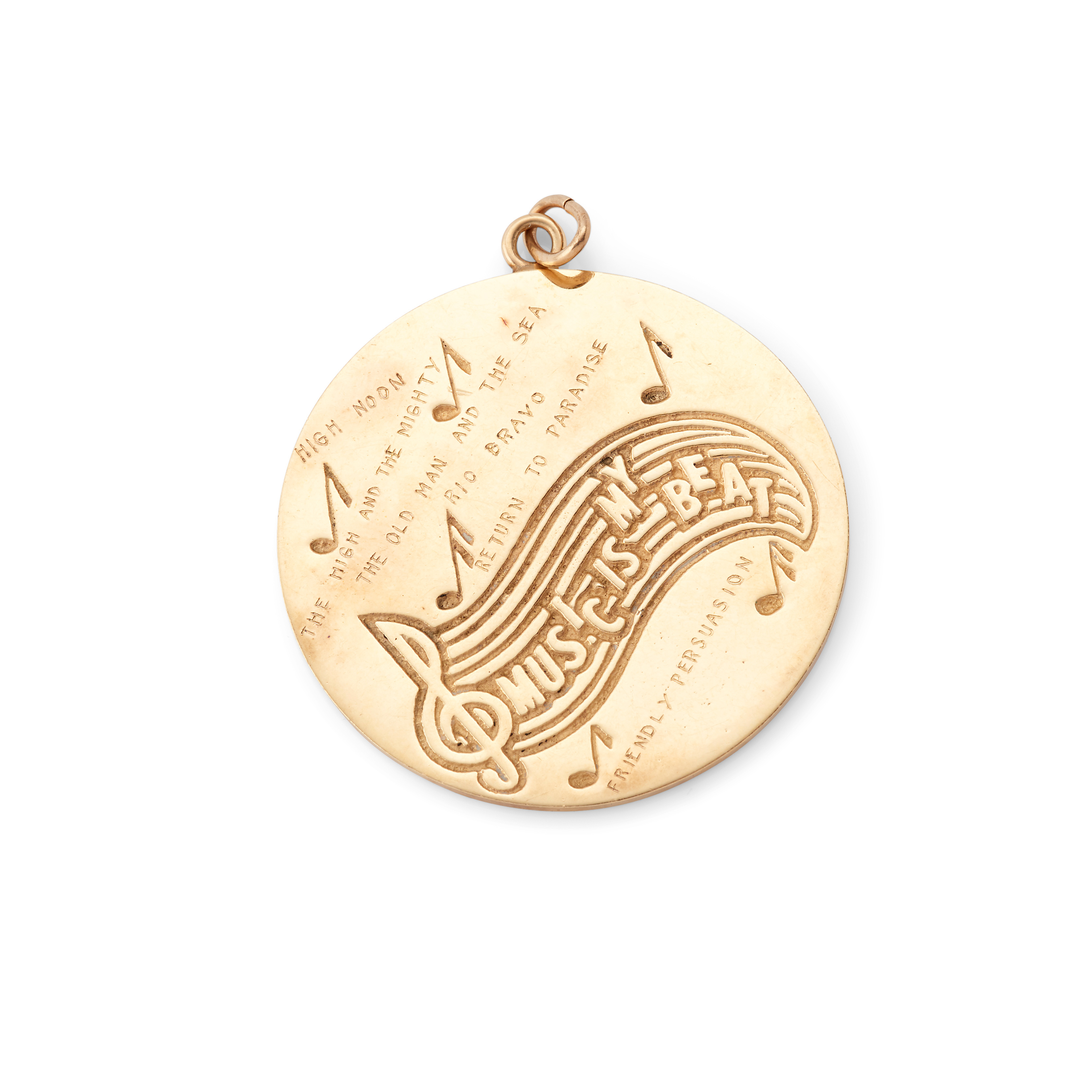 Of circular outline the obverse engraved ‘Music is my beat’ within music score and surrounded by song titles including Rio Bravo, High Noon, Return to Paradise etc, the reverse engraved To Dimitri Tomkin, Larry Finley 6-11-5,