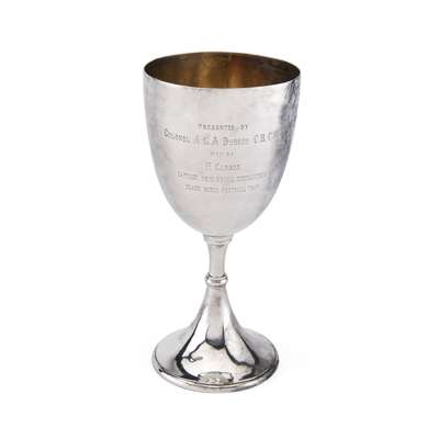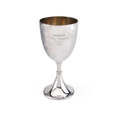 The cup engraved ‘DURAND/ FOOTBALL TOURNAMENT/ SIMLA/ 1898’ to one side and ‘PRESENTED BY COLONEL A.G.A. DURAND C.B. C.I.E./ WON BY H. CARSON CAPTAIN 42nd ROYAL HIGHLANDERS BLACK WATCH FOOTBALL TEAM’ to a slender stem with knopped detail; together with contemporary photograph of the winning football player, cup, medal and dog, in a modern frame (2)