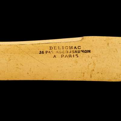 Comprising, eight dessert forks, eight dessert spoons of Fiddle variant pattern; ten teaspoons, by Lapparra & Gabriel and ten mother-of-pearl handled fruit knives, stamped to blade DELIGNAC… A PARIS (38)