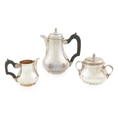 Comprising water pot, twin-handled lidded sugar basin and cream jug, all of baluster form, the leaf clasped handles with roundels to water pot and cream jug, bud finial to water pot and sugar basin (3)