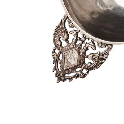Of oval outline, engraved foliate scroll decoration to body, the pierced handles modelled as a double-headed eagle, with coat of arms, including three leaf clover, mimicking the hallmarks to the underside of the oval domed foot with chased decoration of cherubs
