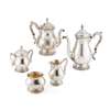 Comprising a water pot, a coffee pot, a sugar basin, a sugar basin with cover and a cream jug, all of Prelude pattern, of baluster outline, bud finial, acanthus clasped S-scroll handles, raised on a domed foot with chased floral scroll border (5)