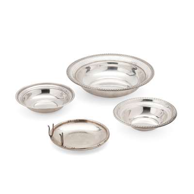 Of circular outline with pierced border and gadrooned edge, with a smaller marked STERLING 116; together with a plan bowl, Gorham, marked STERLING 141 and a butter plate, possibly Balwin and Miller, marked B M STERLING 941 (4)