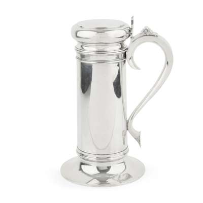 Modelled as an early Georgian covered tankard, with tapered sides, S-scroll handle, pierced thumbpiece, and wide spreading foot, with maker's marks and stamped STERLING 6710