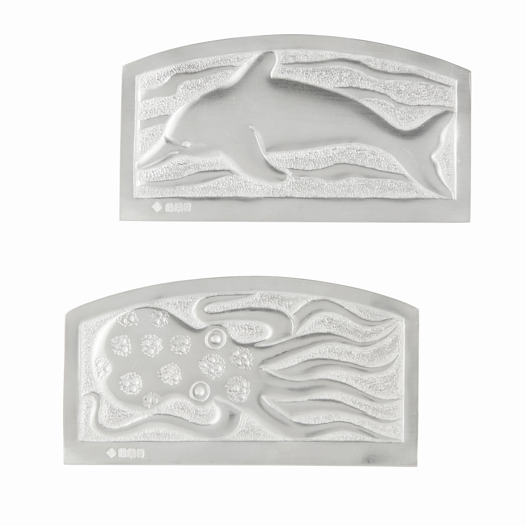 Each of moulded rectangular outline, chased depicting an octopus and a dolphin (2)