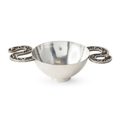 The bowl of plain design with a simple collet foot, the lugs each of S-scroll design, inset with double S-scroll and gilt balls