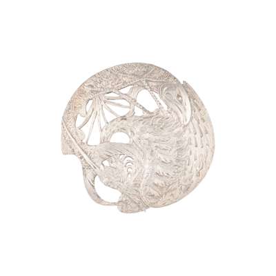 Of circular outline, pierced and engraved, depicting a figural leaping fish to a fauna background
