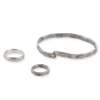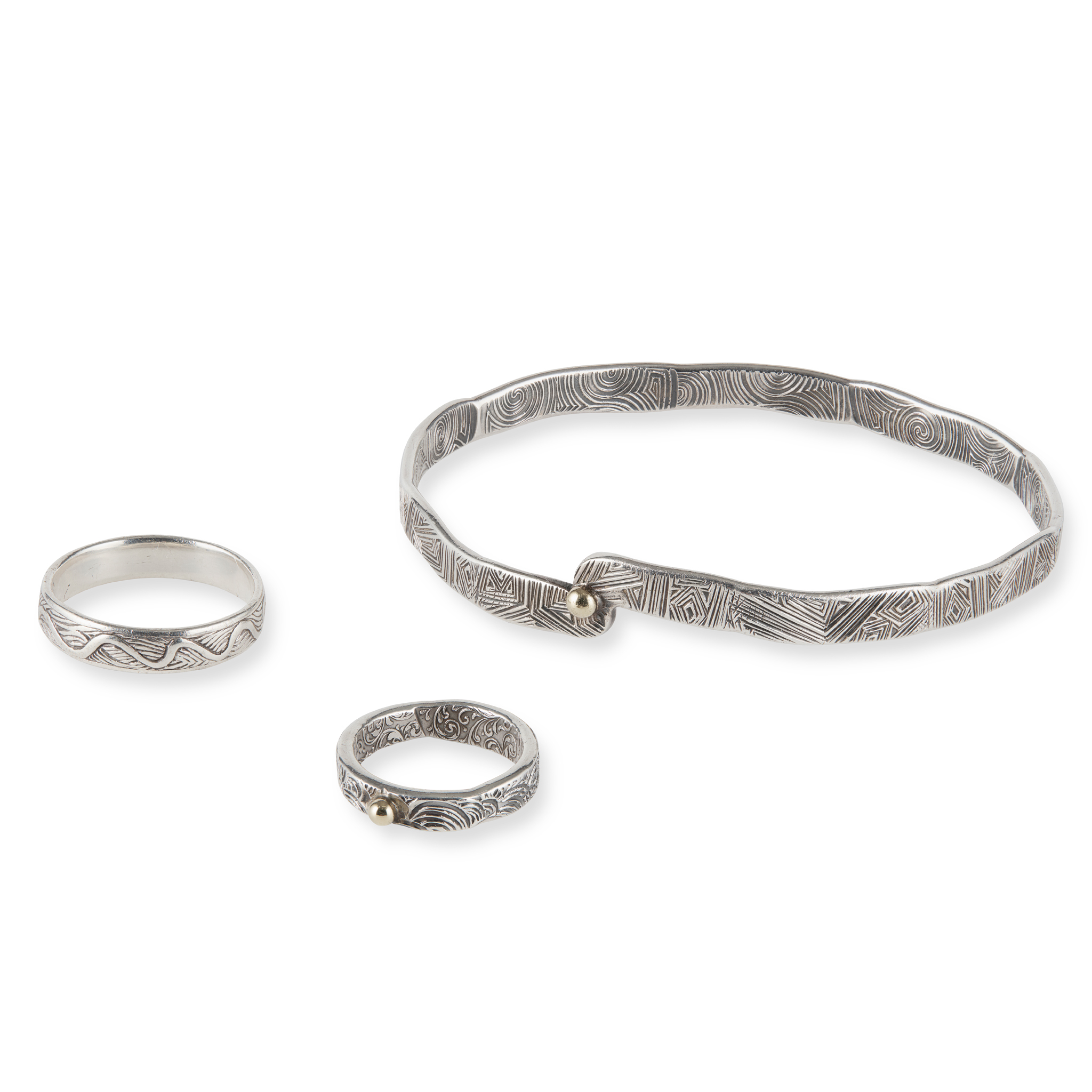 Of organic circular outline, engraved concentric geometric and circular motifs to either side with a silver-gilt bead detail, together with a similar ring and another larger ring, Malcolm Appleby, Edinburgh 2006, engraved with a wave motif, (3)