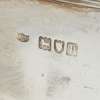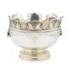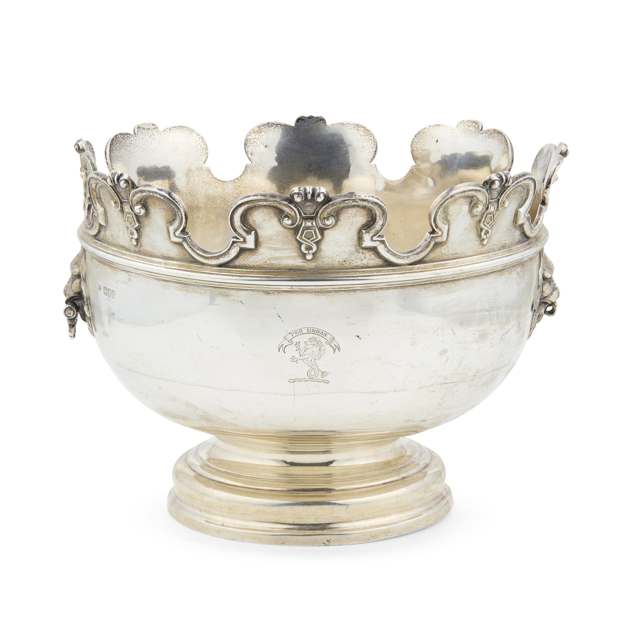 Of traditional form with plain body and scalloped rim with pendant details, engraved crest and motto to body, lion mask handles (one damaged), raised on a stepped domed foot