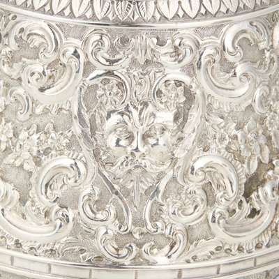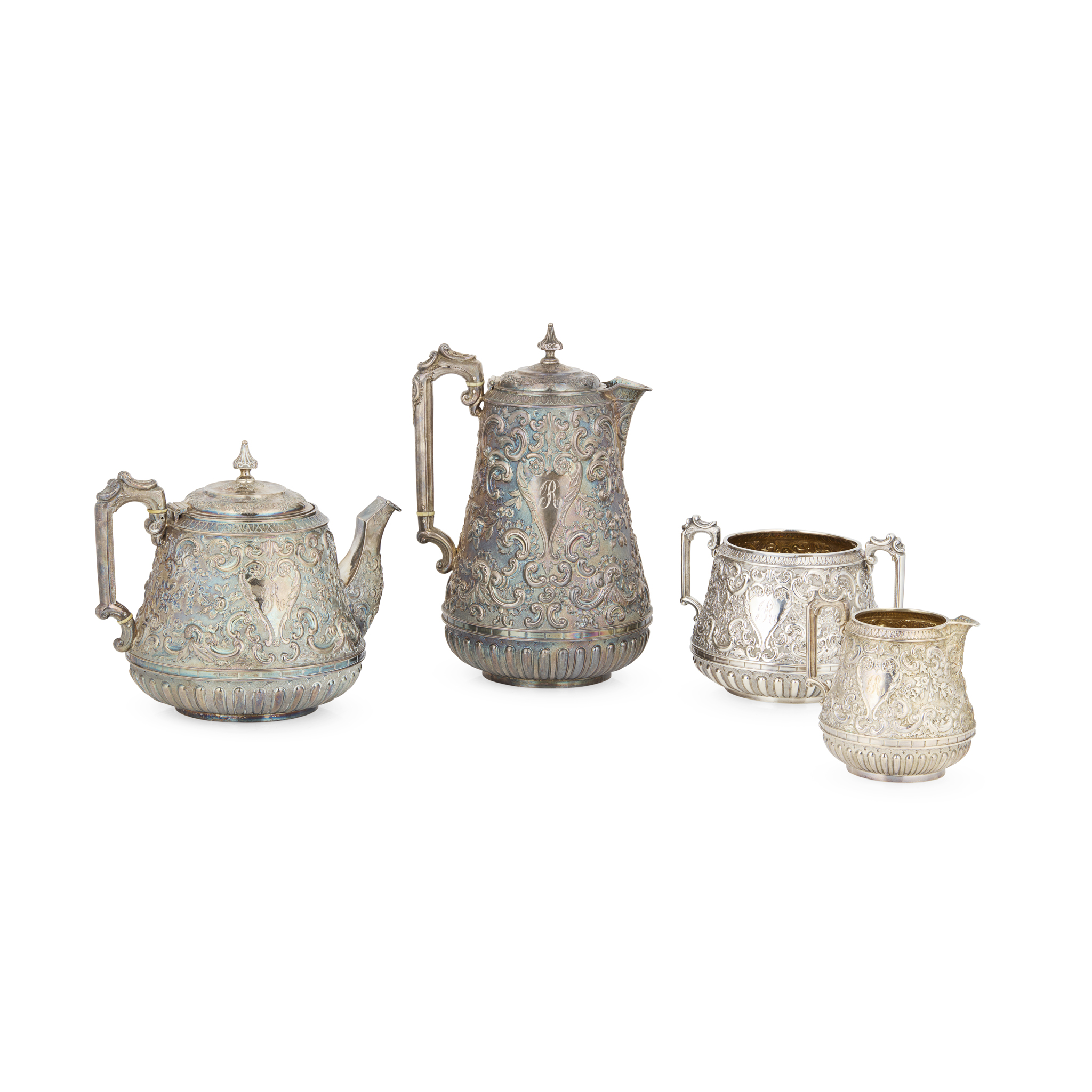 Comprising a waterpot, teapot, twin-handled sugar basin and a milk jug, all of tapered form, profuse scroll and foliate chasing, engraved italic R to heart-shaped cartouche, foliate clasped angular handles, ivory insulators to the water pot and teapot, fluted bases, each raised on a circular foot, presented in a fitted stained mahogany case (4)