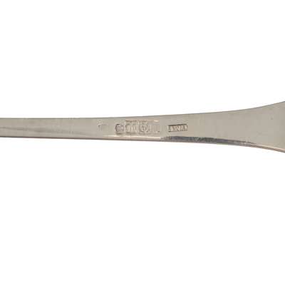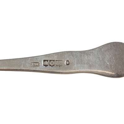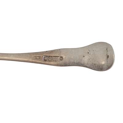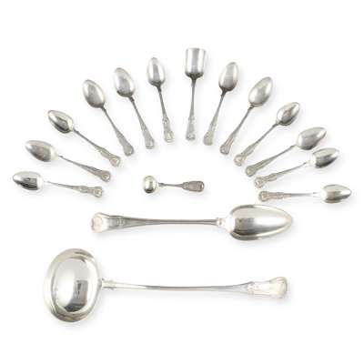 Comprising a single struck soup ladle, Alexander Henderson with J W Howden & Co., Edinburgh 1815, a basting spoon, Peter & William Bateman, London 1813; together with a collection of teaspoons, six by George Jamieson of Aberdeen, six teaspoons and a sugar shovel, J.W. Edinburgh 1853, all of single struck King's pattern; together with a condiment spoon, Edinburgh, crest and motto engraved to terminal (16)