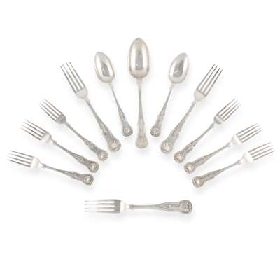 Comprising a tablespoon, Alexander Edmonstoun, Edinburgh 1829, two dessert spoons, Edinburgh 1865 and 1868, three table forks, Andrew Wilkie, Edinburgh 1836 and six dessert forks, James & Walter Marshall, Edinburgh 1852, all of single struck King's pattern, all with various initials engraved to terminal (12)