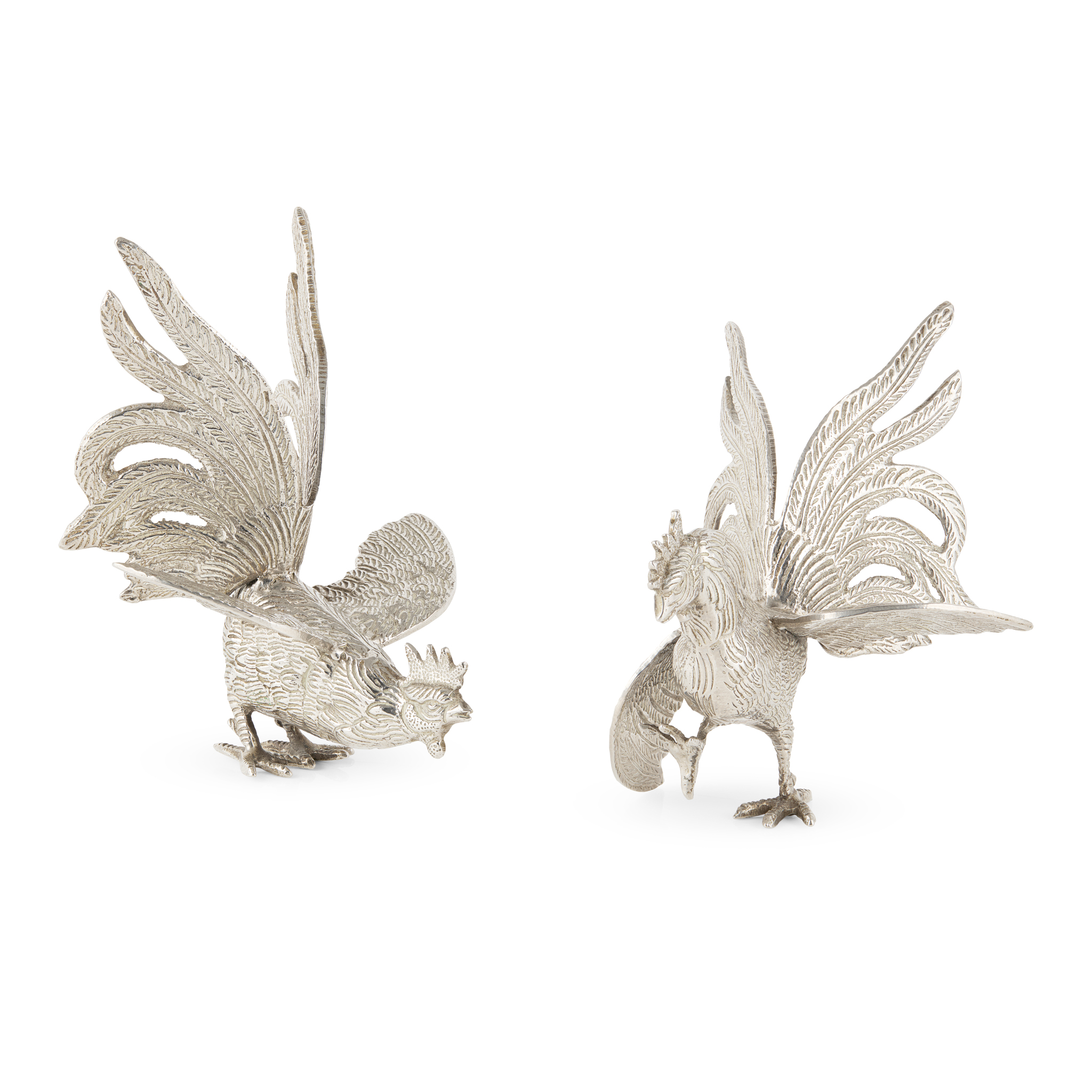 A PAIR OF 20TH CENTURY SILVER-PLATED ITALIAN COCKERELS