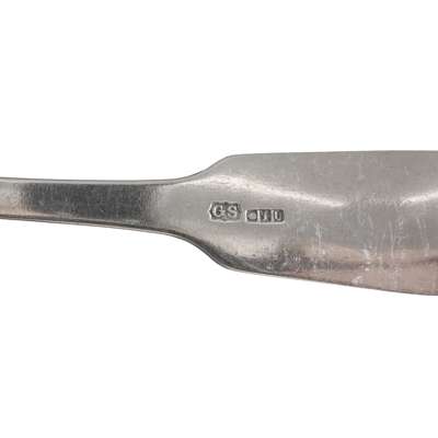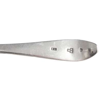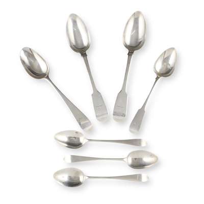 Marked JE, three towers, JE, of Celtic Point pattern, engraved S to terminal; together with a dessert spoon, Charles Murray of Perth, marked CM, double headed eagle, CM, double-headed-eagle, of Fiddle pattern, engraved initials to terminal and a tablespoon, marked WS twice, of Old English pattern, engraved initials to terminal; together with two plated tablespoons, of Fiddle pattern (7)