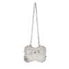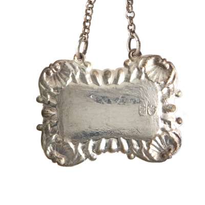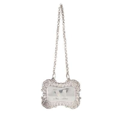 Marked AD, plant, of rounded rectangular outline, fluted border with shell corners, engraved M to centre, with belcher link suspension