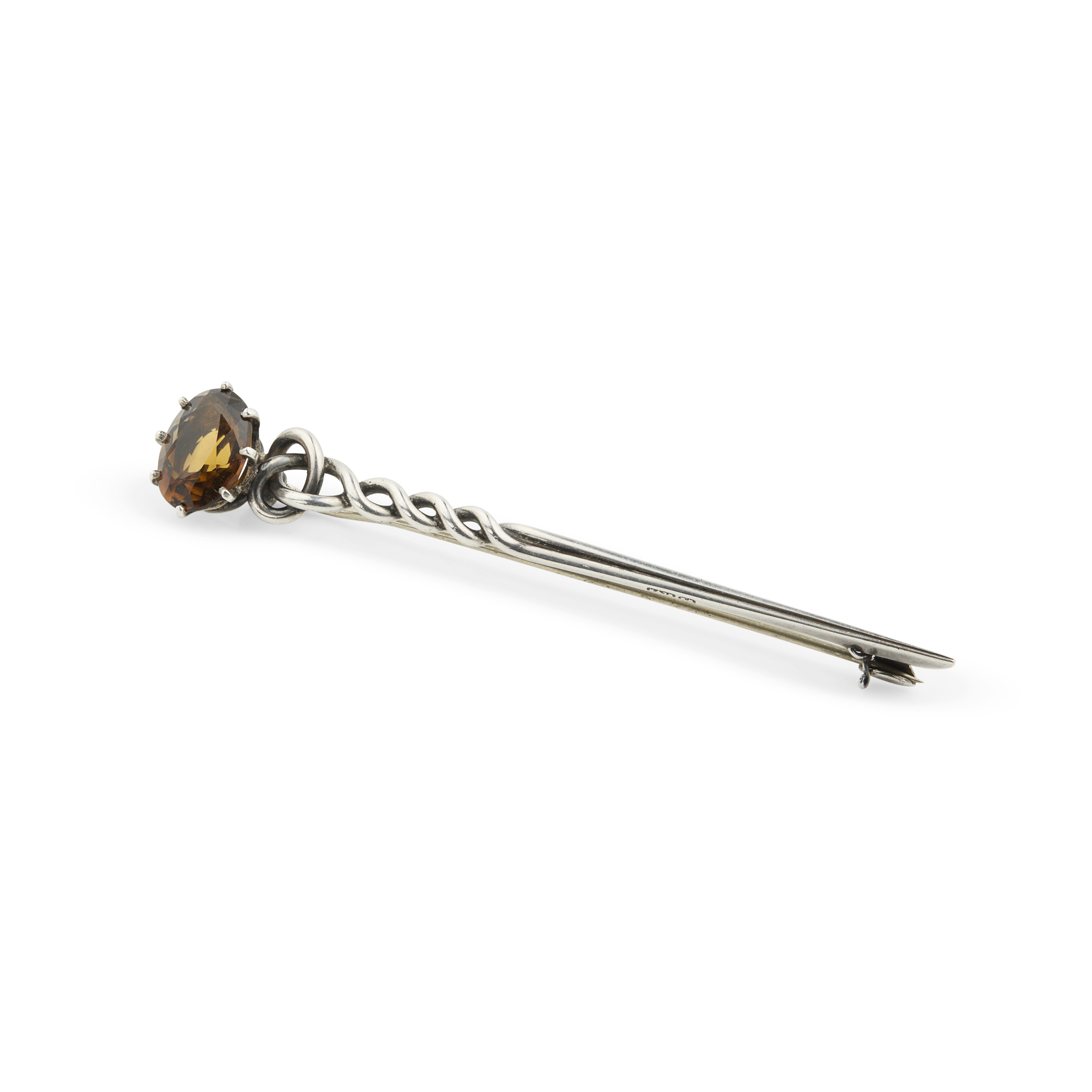 Marked, W.R., BLTR, the claw set citrine finial above intertwined tapered stem, with simple hinged pin a X formed safety catch