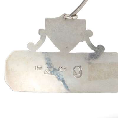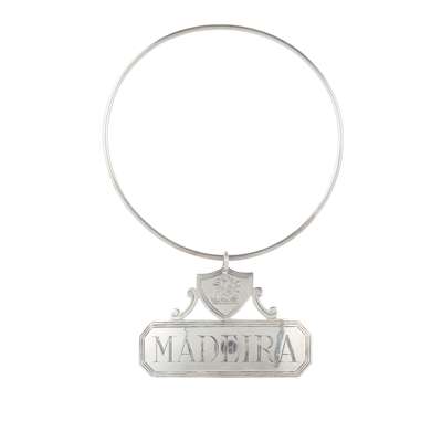 Marked IT, anchor, IT, oak tree, of rectangular outline with canted threaded edges, engraved MADEIRA to centre, surmounted by a shield cartouche and scroll supports, engraved with crest, to a ring loop